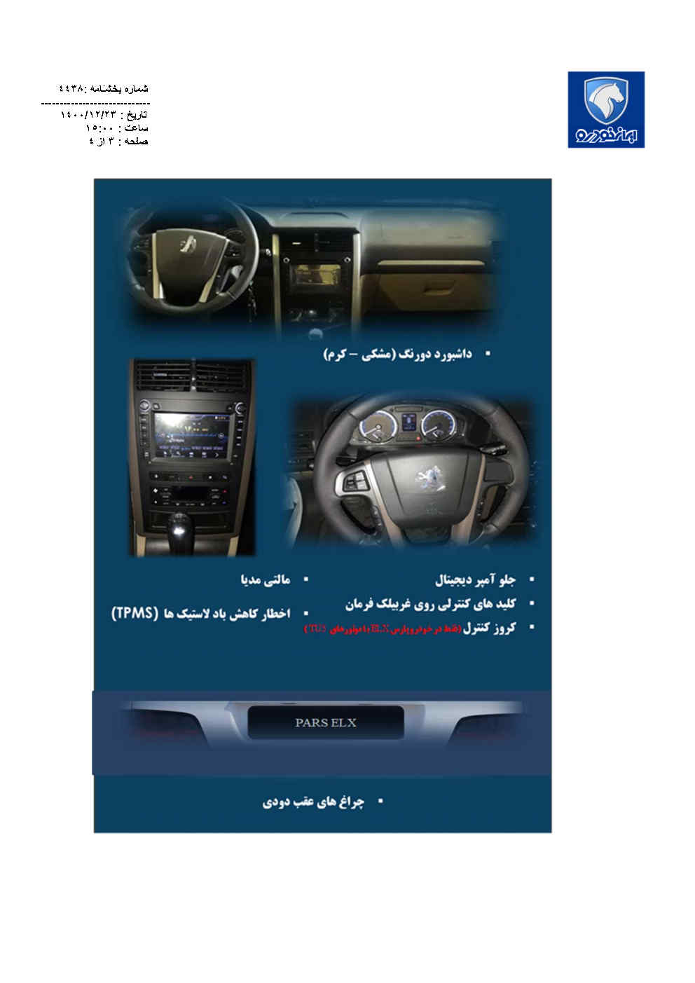 | | مالتي مديا دوربين ديد عقب رينگ هاي آلومينيومي ترمز هاي عقب ديسكي كروز كنترل (فقط در خودرو پارس سفارشي ELX با موتور TU5) اخطار كاهش باد لاستيك ها TPMS جلو آمپر جديد ديجيتال دسته راهنماي طرح جديد سنسور نور و باران صندلي هاي جلو برقي دو حركته با روكش پارچه اي طرح جديد شيشه هاي عقب دودي قطعات دكوراتيو طرح جديد داشبورد دورنگ (مشكي - كرم) كليدهاي كنترلي روي غربيلك فرمان (MFC) چراغ هاي عقب دودي |