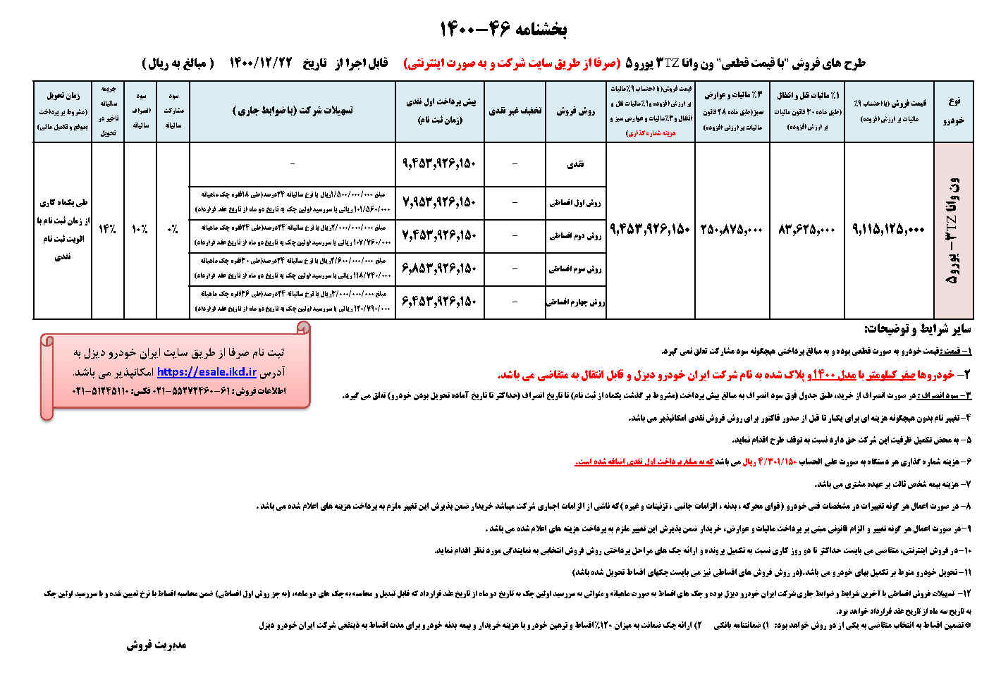 طرح های فروش "با قیمت قطعی" ون وانا 3TZ یورو 5 ( صرفا از طریق سایت شرکت و به صورت اینترنتی) قابل اجرا از تاریخ 1400/12/22 ( این بخشنامه دیگر قدیمی می باشد بخشنامه های جدید در اینجا)