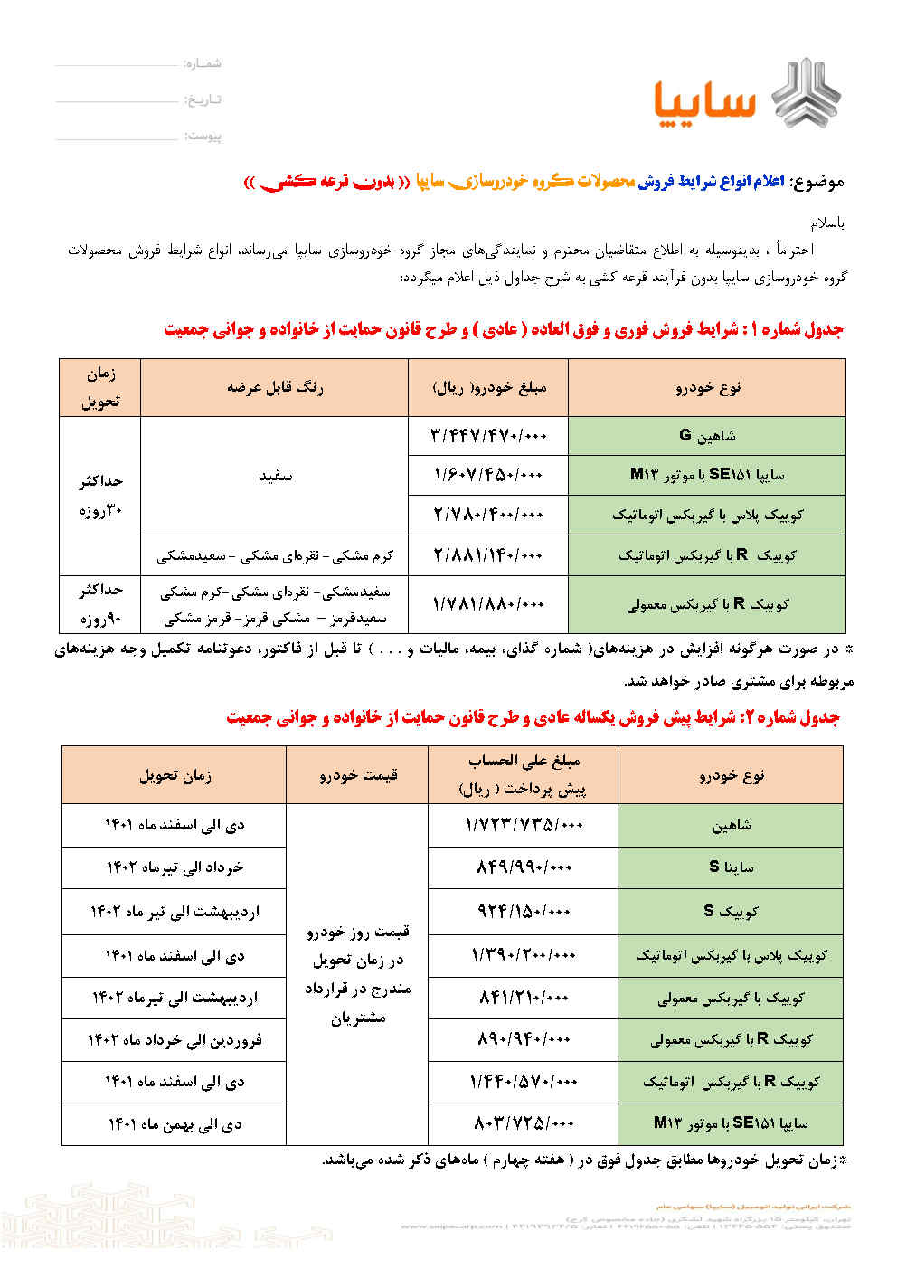 گروه خودروسازي سايپا بدون فرآيند قرعه كشي به شرح جداول ذيل اعلام ميگردد: