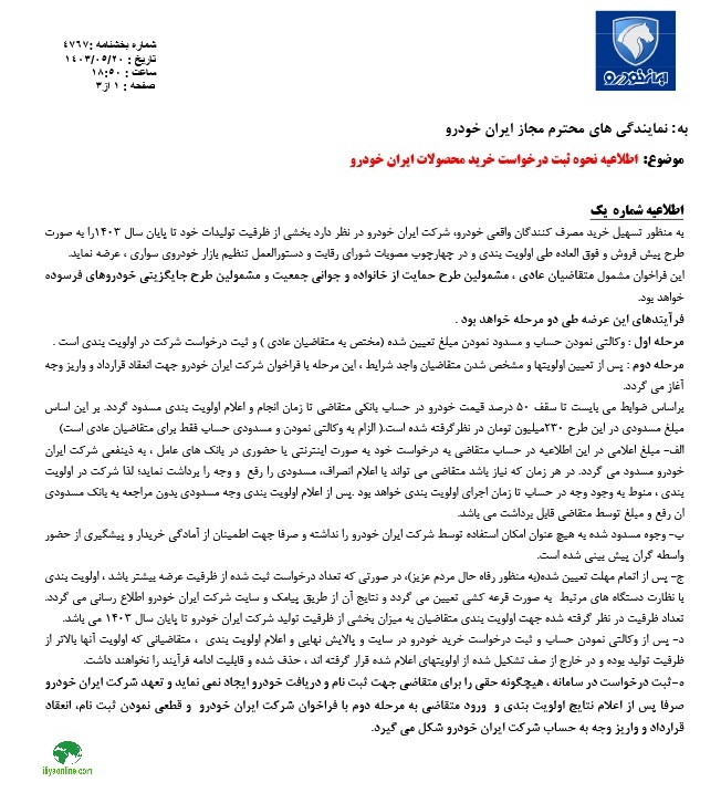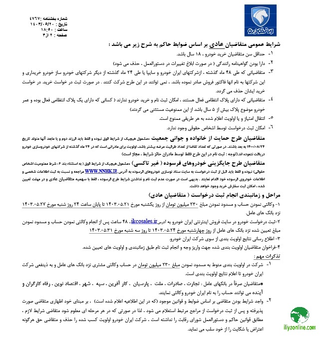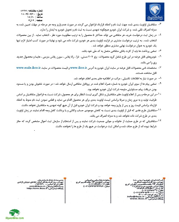 - در صورت برنده شدن مشتری و عدم انعقاد قرارداد و واریز وجه، ایران خودرو هیچ تعهدی در راستای تحویل خودرو نخواهد داشت.