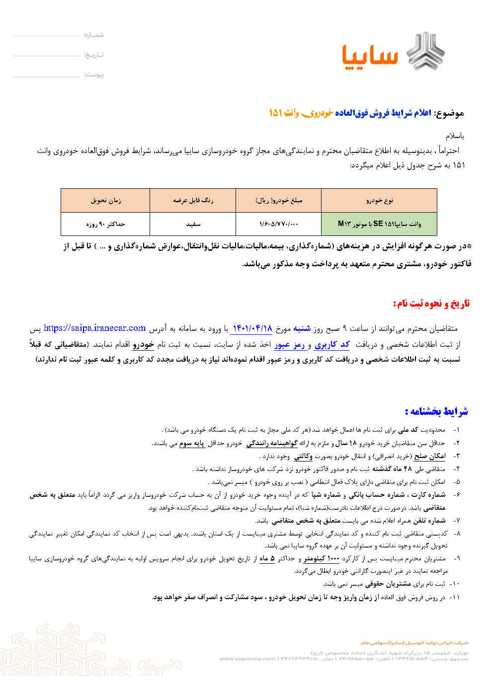 متقاضیان محترم میتوانند از ساعت ۹ صبح روز شنبه 1401/04/18 با ورود به سامانه یکپارچه تخصیص خودرو به آدرس https://sale.iranecar.com پس از ثبت اطلاعات شخصی و دریافت کد کاربری و رمز عبور اخذ شده از سایت، نسبت به انتخاب نوع خودرو و ثبت نام اقدام نمایند. لازم به ذکر است شرکت در این طرح صرفاً از طریق آدرس فوق امکان پذیر بوده و در صورت استفاده متقاضی از سایر آدرسها، عواقب آن بر عهده گروه خودروسازی سایپا نخواهد بود