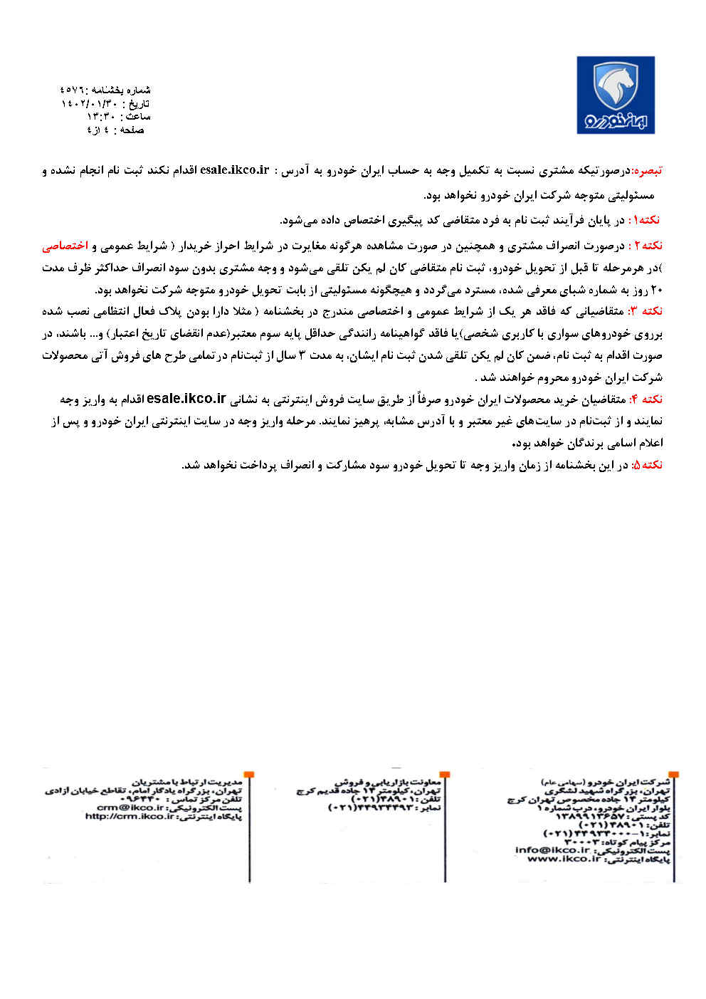 نكته 5: مشتري مي تواند جهت كسب اطلاعات از و ضعيت قرارداد ، صدور سند(فاكتور فروش) و پلاك خودروي ثبت نامي به پروفايل شخصي و ميز خدمت مشــتري به نشــاني اينترنتي : esale.ikco.ir و customer.ikco.ir و براي اطلاع از ضــوابط فروش به ســايت ايران خودرو به نشــاني اينترنتي. مراجعه نمايد