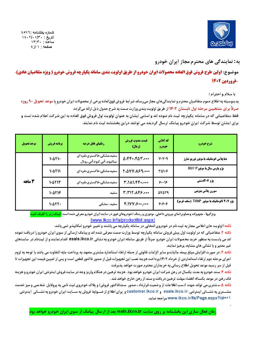 بدينوسيله به اطلاع عموم متقاضيان محترم و نمايندگيهاي مجاز ميرساند شرايط فروش فوقالعاده برخي از محصولات ايران خودرو با موعد تحويل 90 روزه صرفاً براي منتخبين مرحله اول تابستان 1402از طريق اولويت بندي وزارت صمت به شرح جدول ذيل ارائه ميگردد.