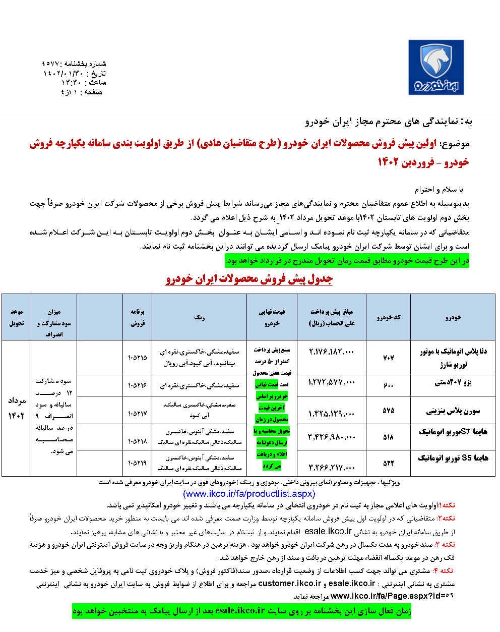 موضوع: اولين پيش فروش محصولات ايران خودرو (طرح متقاضيان عادي) از طريق اولويت بندي سامانه يكپارچه فروش خودرو – فروردين 1402