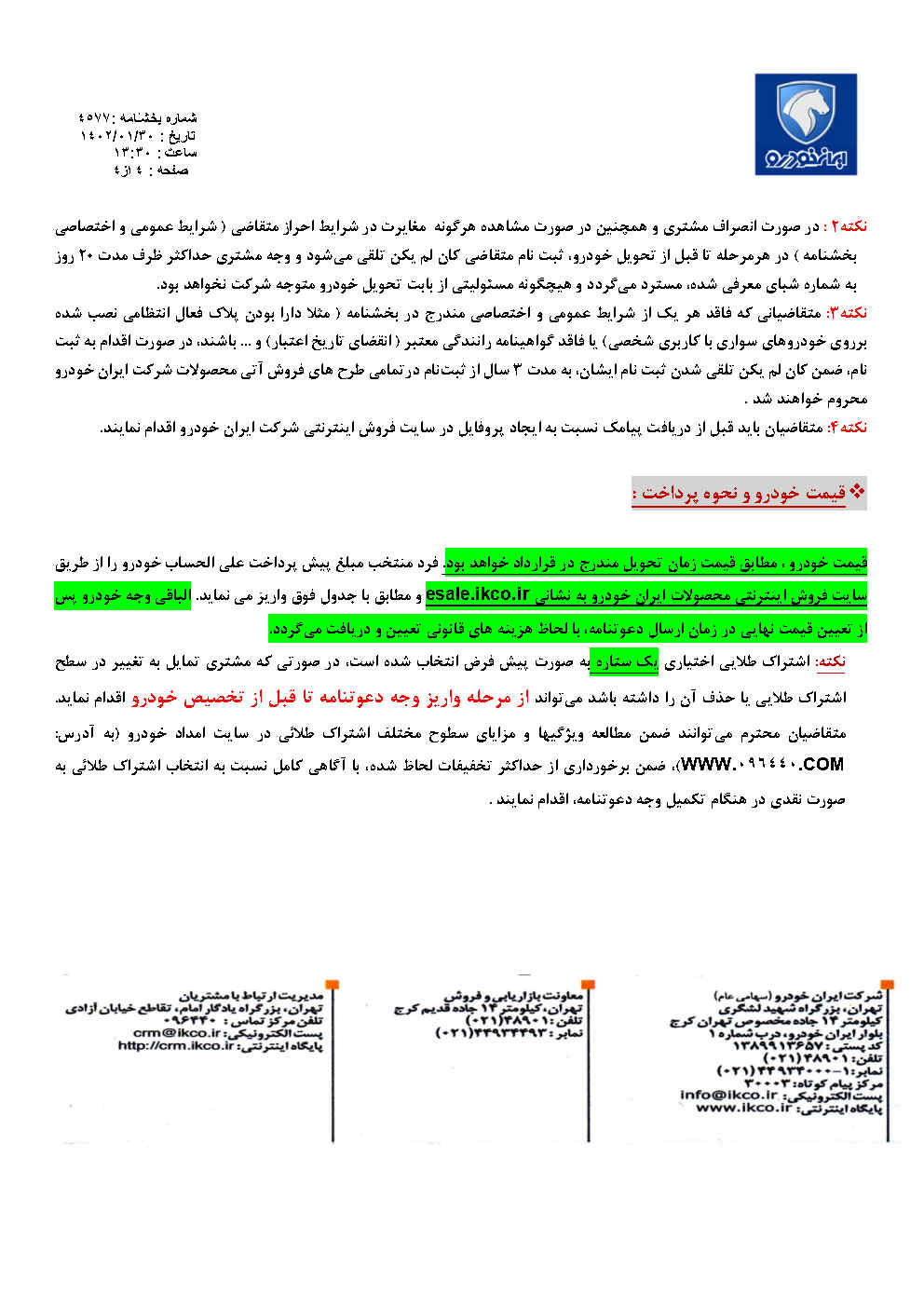 نكته 1: در صورت عدم واريز كامل پيش پرداخت علي الحساب خودرو، ثبت نام متقاضي كان لم يكن تلقي ميگردد