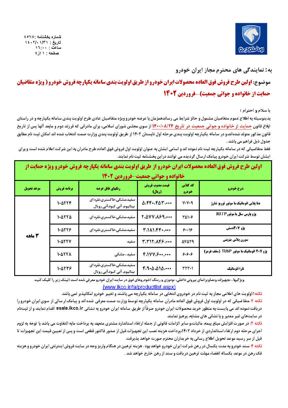 طرح فروش فوق العاده ( با موعد تحويل 90روزه ) ويژه متقاضيان حمايت از خانواده وجواني جمعيت برابر با اولويت بندي اعلام شده وزارت صمت مطابق با جدول ابتداي بخشنامه از روز پنجشنبه مورخ 1402/01/31 شروع و تا روز پنجشنبه 1402/02/14 ادامه خواهد داشت.