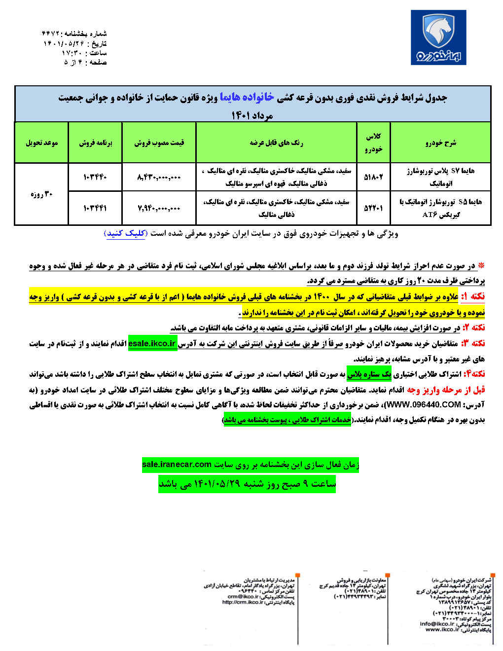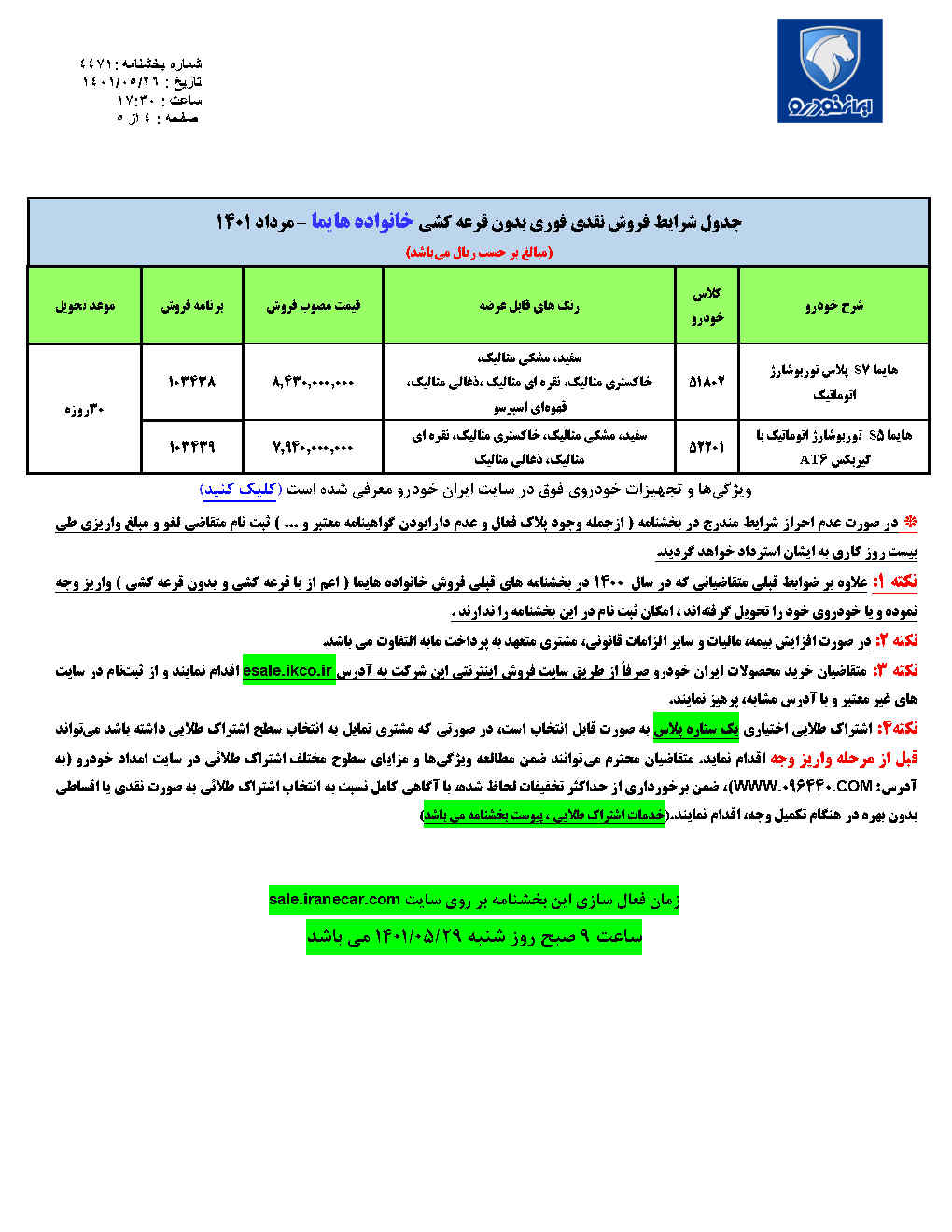 بدینوسیله به اطلاع عموم متقاضیان محترم و نمایندگیهای مجاز می رساند، شرکت ایران خودرو طرح فروش نقدی فوری خانواده هایما (بدون قرعه کشی) باموعد تحویل ۳۰ روزه را با شرایط جدول ذیل ارائه مینماید: