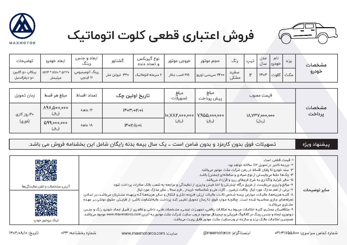 به گزارش "ایلیا آنلاین"، شرایط فروش پیکاپ کلوت اتوماتیک مکث موتور با پیش پرداخت ۷۹۵ میلیون تومانی آغاز شده است. مابقی قیمت مصوب این خودرو به مبلغ۱,۰۷۸,۲۰۰۰,۰۰۰ تومانبه صورت تسهیلات ۱۲ و ۱۸ ماهه به صورت ماهانه پرداخت خواهد شد. مبلغ هر قسط برای تسهیلات ۱۲ ماهه ۸۹,۸۵۰,۰۰۰ تومان و برای تسهیلات ۱۸ ماهه ۵۹,۹۰۰,۰۰۰ تومان است. موعد تحویل آن ۳۰ روزکاری از اعلام شده است.
