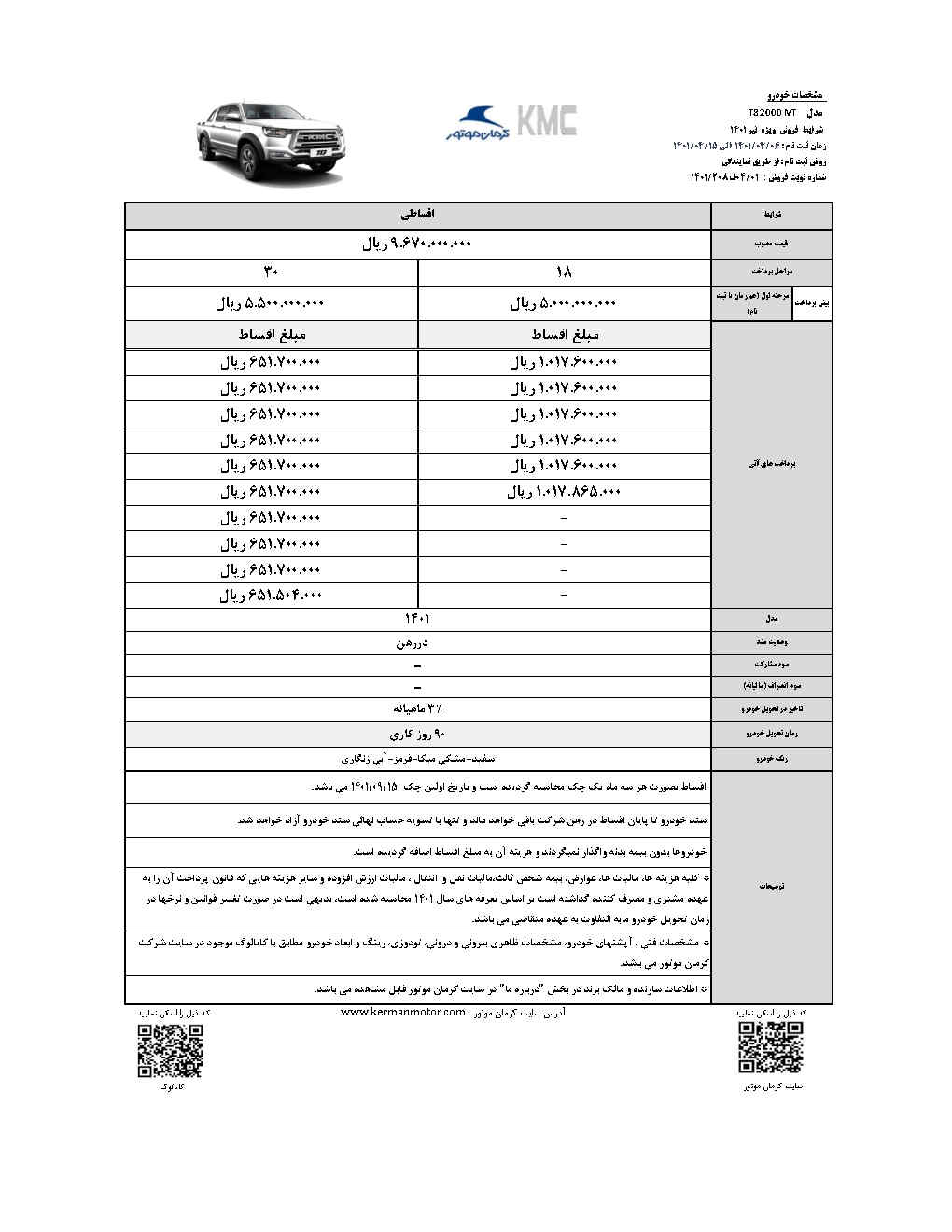 کرمان موتور شرایط فروش KMC T8 را با قیمت جدید اعلام کرد و قرار است تا این پیکاپ را با قیمت قطعی و به صورت نقدی و اقساطی به فروش برساند.