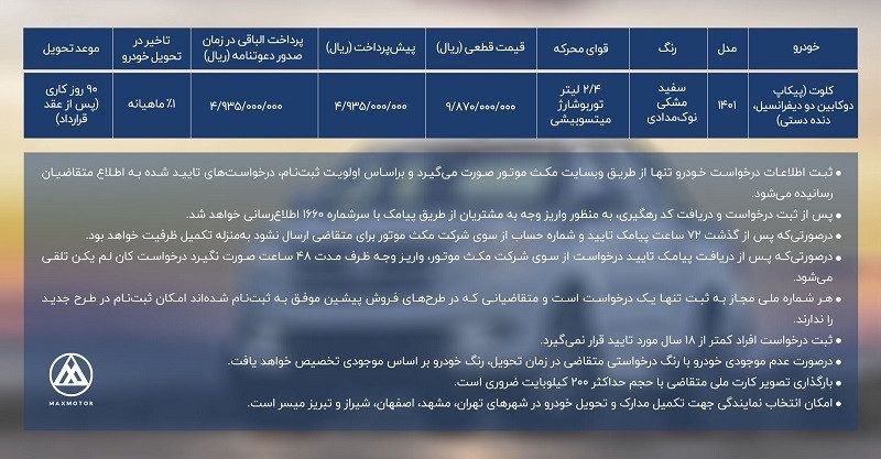 جدیدترین شرایط فروش پیکاپ کلوت اعلام شد. شرکت مکث موتور اعلام کرد که از یکشنبه، ۸ خرداد، فروش پیکاپ کلوت دنده دستی آغاز خواهد شد و متقاضیان خرید می توانند با مراجعه به آدرس www.maxmotorco.com از ساعت ۱۰:۰۰ صبح، درخواست خود را برای فروش این خودرو با موعد تحویل ۹۰ روزه ثبت نمایند.