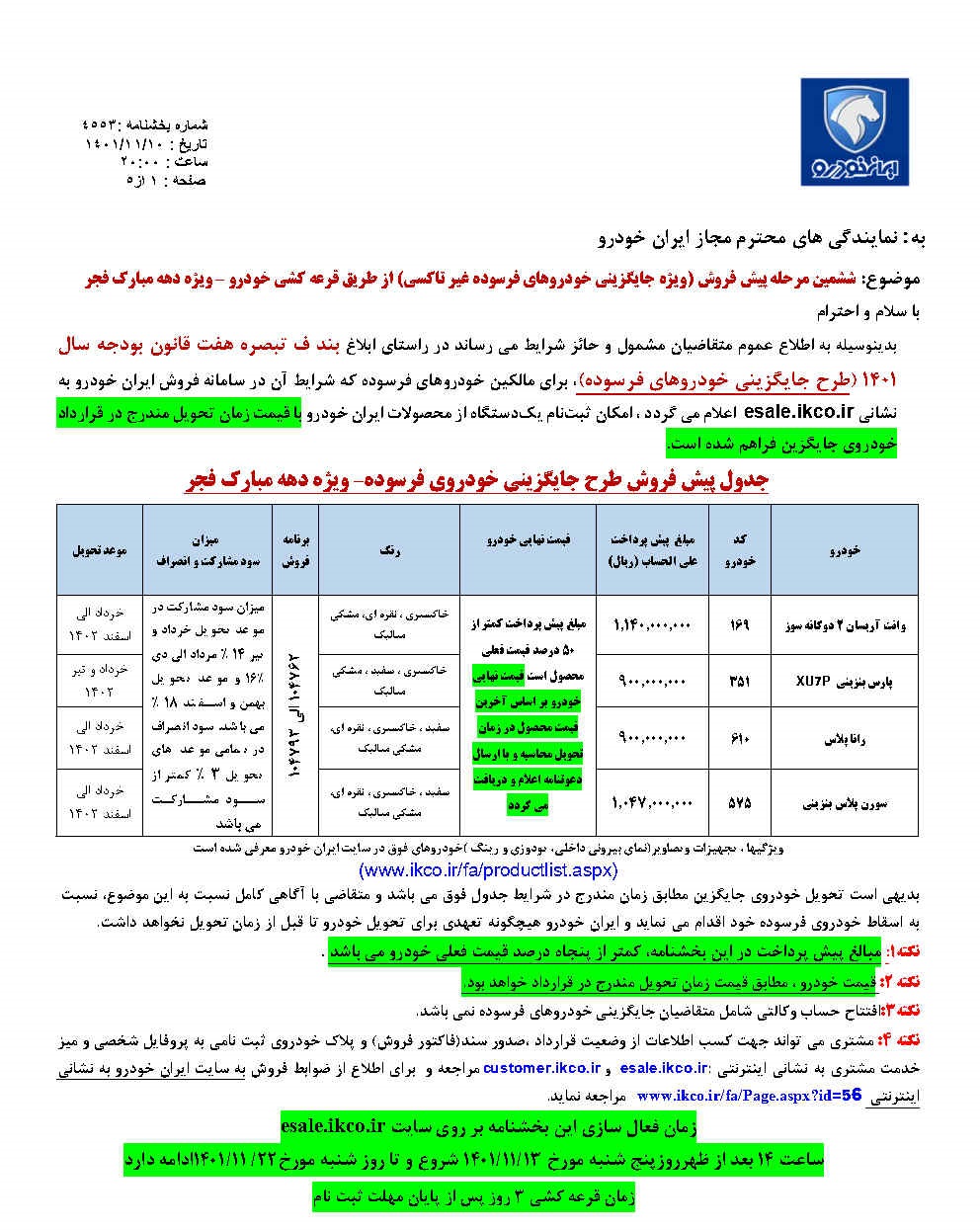 طرح پيش فروش ويژه متقاضيان جايگزيني خودروهاي فرسوده مطابق جدول فوق از روز پنج شنبه.مورخ 1401/11/13 شروع و تا روز شنبه مورخ 1401/11/22 ادامه خواهد داشت