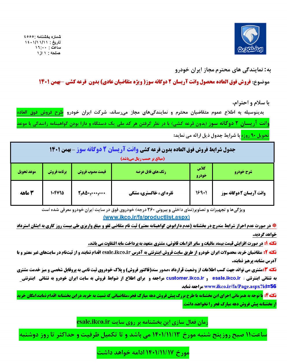 بدينوسيله به اطلاع عموم متقاضيان محترم و نمايندگيهاي مجاز ميرساند، شركت ايران خودرو طرح فروش فوق العاده