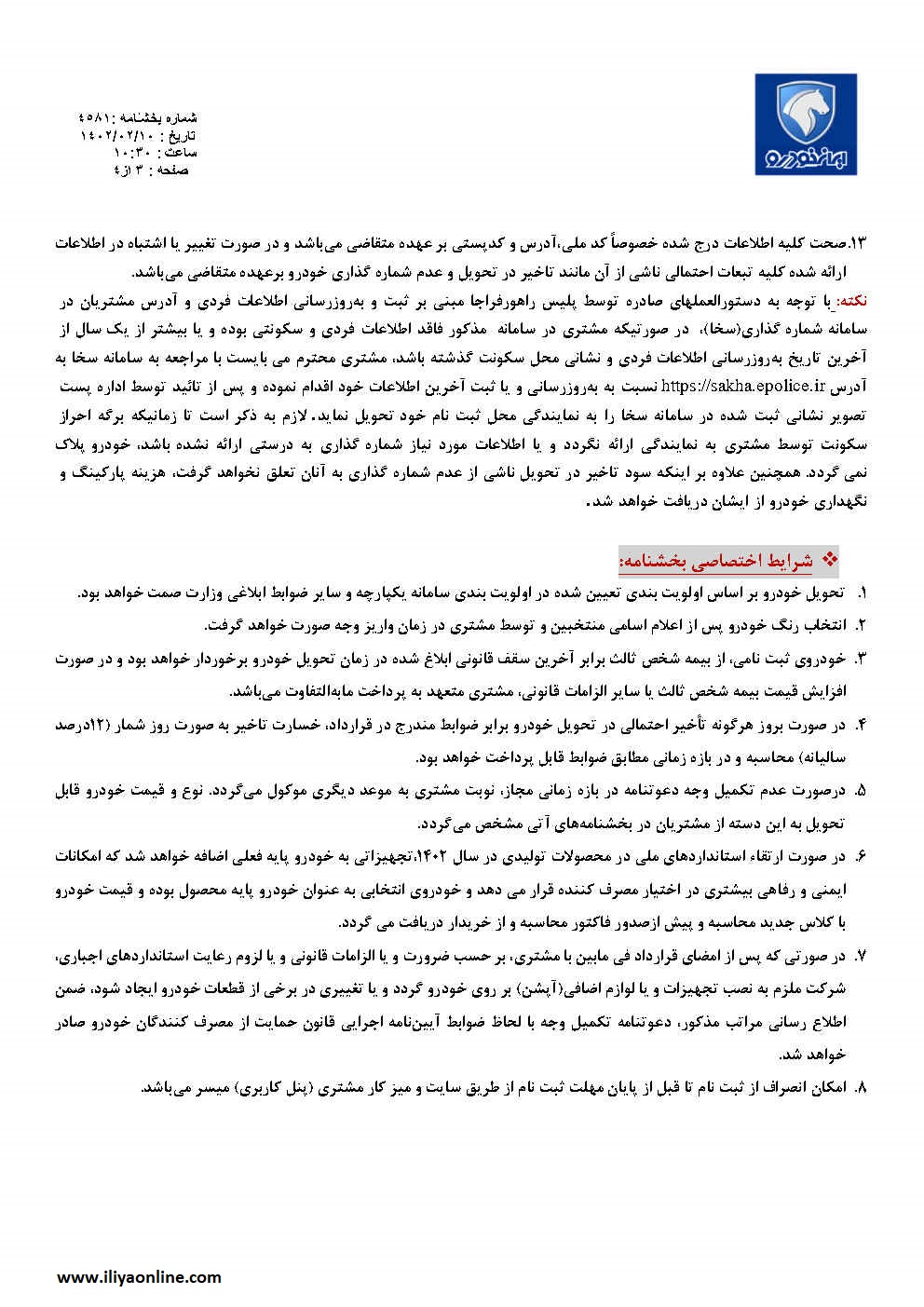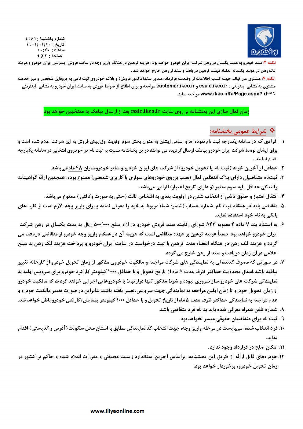 نكته 3: متقاضياني كه فاقد هر يك از شرايط عمومي و اختصاصي مندرج در بخشنامه (مثلا دارا بودن پلاك فعال انتظامي نصب شده برروي خودروهاي سواري با كاربري شخصي) يا فاقد گواهينامه رانندگي معتبر ( انقضاي تاريخ اعتبار) و ... باشند، در صورت اقدام به ثبت نام، ضمن كان لم يكن تلقي شدن ثبت نام ايشان، به مدت 3سال از ثبتنام درتمامي طرح هاي فروش آتي محصولات شركت ايران خودرو محروم خواهند شد .