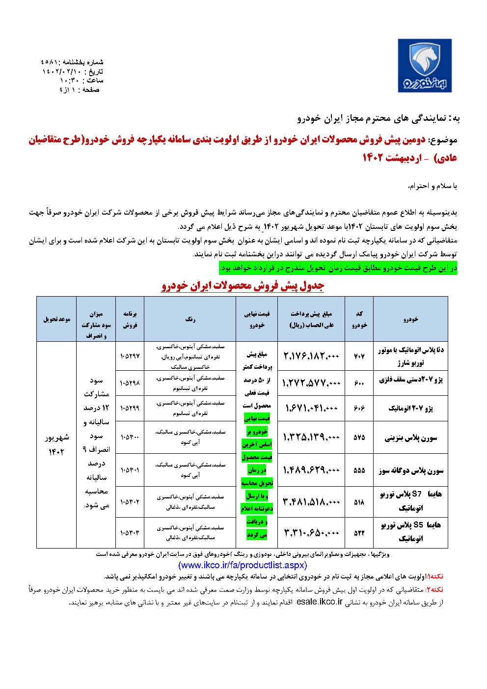 بدينوسيله به اطلاع عموم متقاضيان محترم و نمايندگيهاي مجاز ميرساند شرايط پيش فروش برخي از محصولات شركت ايران خودرو صرفاً جهت بخش سوم اولويت هاي تابستان 1402با موعد تحويل شهريور 1402 به شرح ذيل اعلام مي گردد.