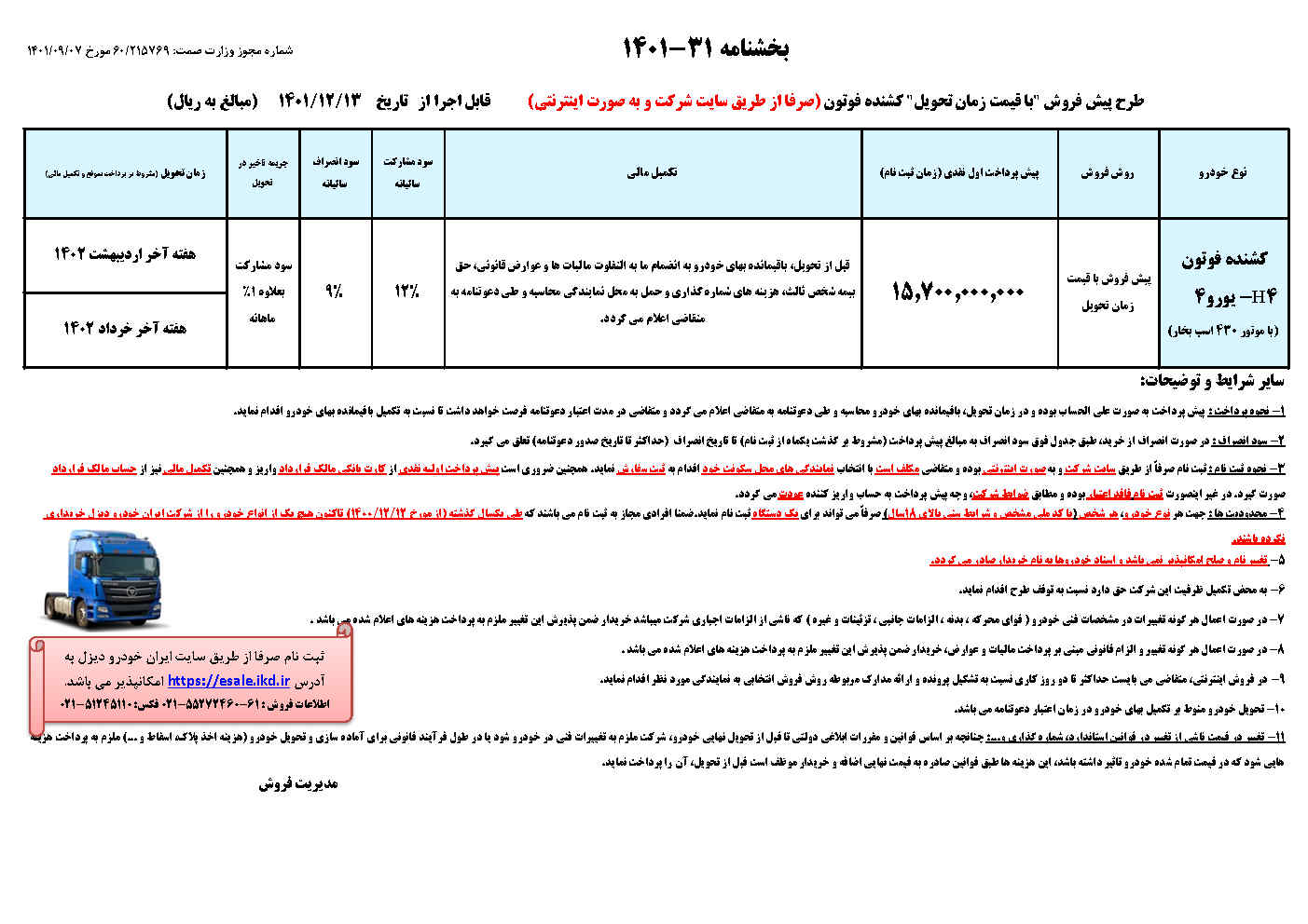 دانلود بخشنامه 31-1401 | پیش فروش کشنده فوتون H4 |