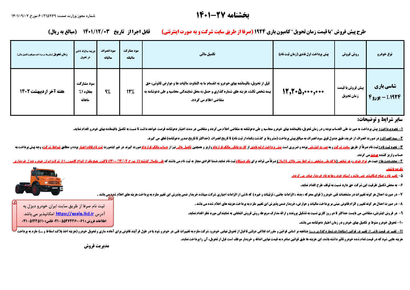 بخشنامه 27-1401: طرح پیش فروش کامیون باری 1924: