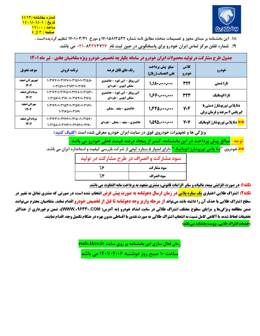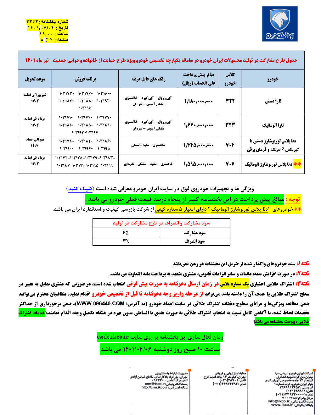 البته ایران خودرو در قالب اطلاعیه ای اعلام کرده است مبلغ پیش پرداخت در این بخشنامه کمتر از 50 درصد قیمت فعلی خودرو است. سود مشارکت 6 درصدی و سود انصراف 2 درصدی در این طرح مدنظر قرار گرفته است.