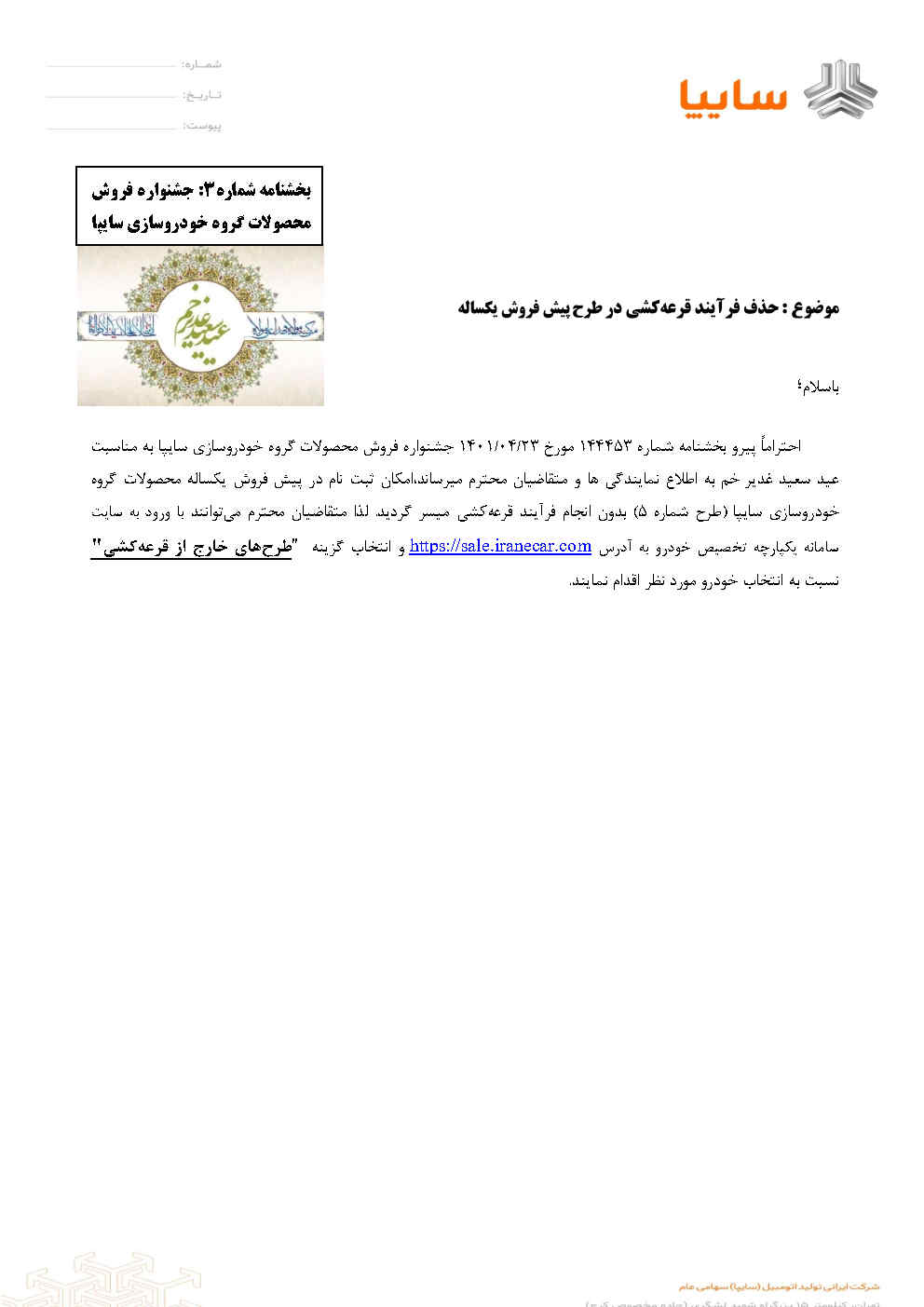 گروه خودروسازی سایپا از 25 تیرماه جشنواره فروش محصولات خود را در قالب 11 طرح فروش به مناسبت عیدسعید غدیرخم آغاز کرده و در طرح پیش فروش یکساله وانت سایپا 151 فرایند قرعه کشی حذف شده و متقاضیان محترم خرید خودروی مذکور می توانند با مراجعه با سامانه یکپارچه تخصیص خودرو به آدرس http://sale.iranecar.com و انتخاب گزینه ( طرح های خارج از قرعه کشی) خودروی مذکور را ثبت نام کنند.