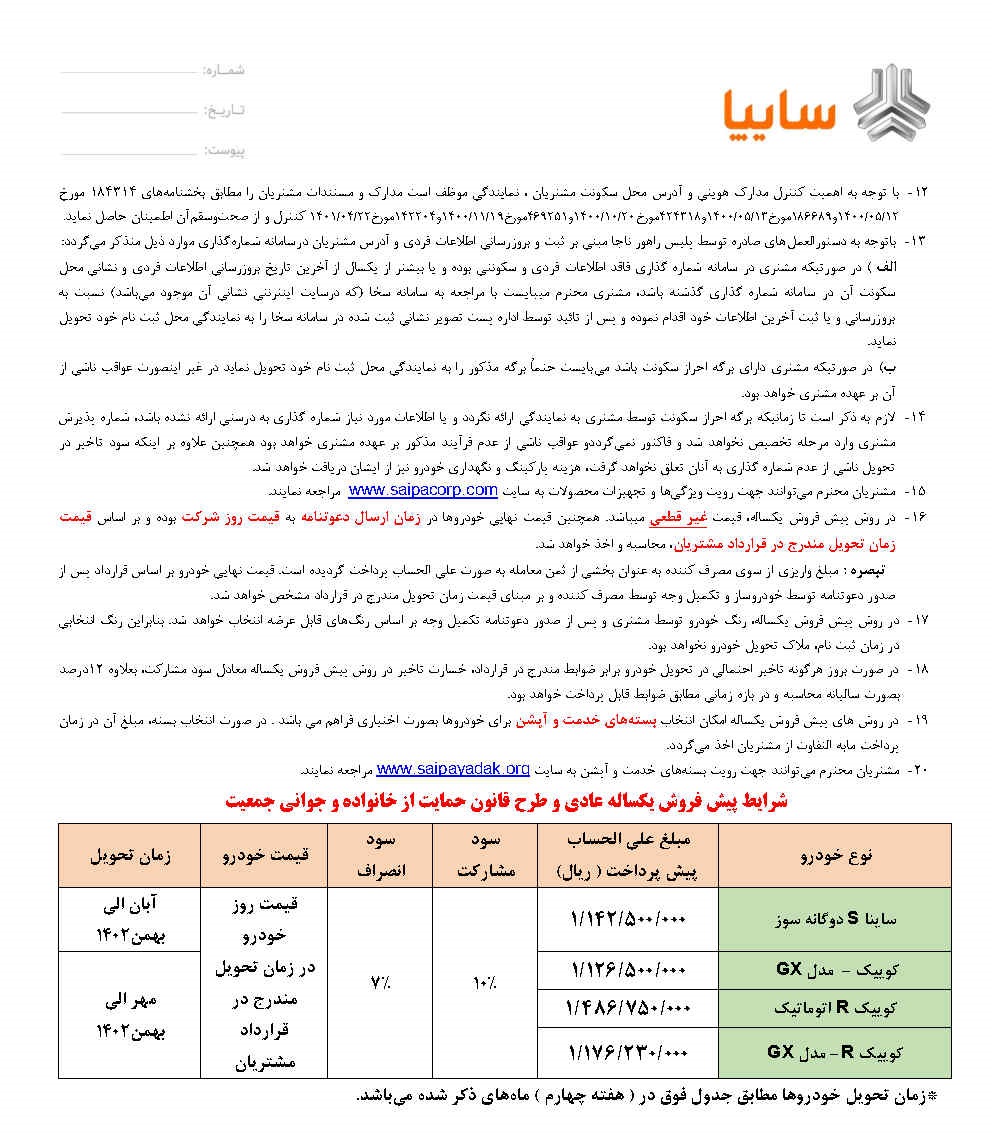 - در راستای ابلاغ قانون حمايت از خانواده و جوانی جمعیت مصوبه شورای اسلامی به تاريخ ، 1400/08/19 گروه خودروسازی سايپا امکان ثبت نام يک دستگاه از محصولات مطابق جدول فوق را برای مادرانی که فرزند دوم و مابعد آنها پس از تاريخ مذکور متولد شده اند بشرح اين بخشنامه فراهم نموده است