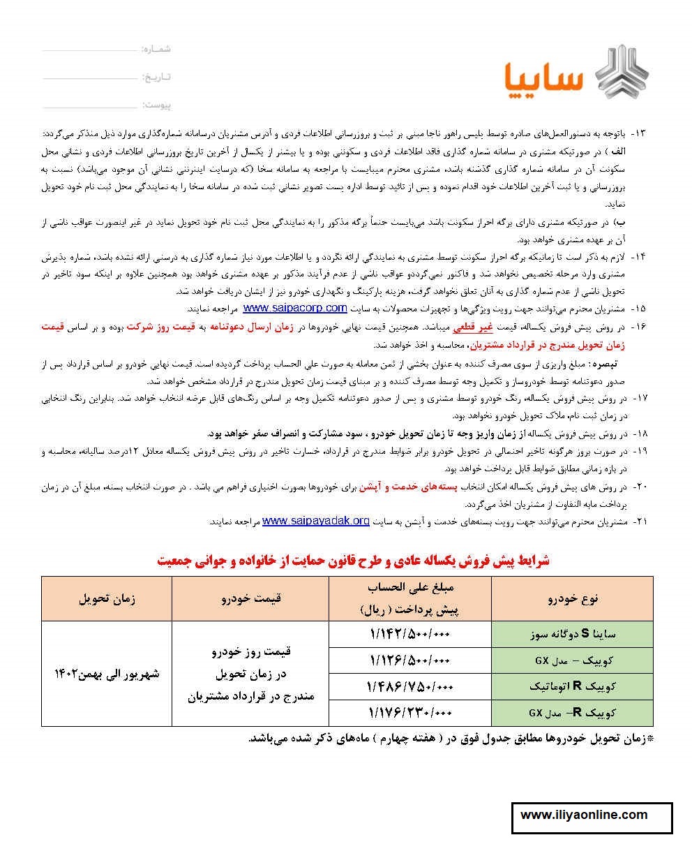 | * در راستای ابلاغ قانون حمايت از خانواده و جواني جمعيت مصوبه شورای اسلامي به تاريخ ،1400/08/19 گروه خودروسازی سايپا امكان ثبت نام يك دستگاه از محصولات مطابق جدول فوق را برای مادراني که فرزند دوم و مابعد آنها پس از تاريخ مذکور متولد شدهاند بشرح اين بخشنامه فراهم نموده است. * درطرحهای قانون حمايت از خانواده و جواني جمعيت جهت کليه محصولات طرح مذکور ابتدا پيش ثبت نام انجام ميپذيرد و پس از شناسايي مادران حائز شرايط امكان ثبت نام نهايي و واريز وجه ميسر خواهد شد. * در طرحهای قانون حمايت از خانواده و جواني جمعيت محدوديت پلاك فعال، حداقل سن 18سال، دارا بودن گواهينامه رانندگي، عدم خريد 48ماه گذشته برای مادران حائز شرايط لحاظ نخواهد شد. * در طرحهای قانون حمايت از خانواده و جواني جمعيت هر کدملي تنها مجاز به ثبت نام يك دستگاه خودرو در يكي از شرکتهای خودروساز ميباشد |