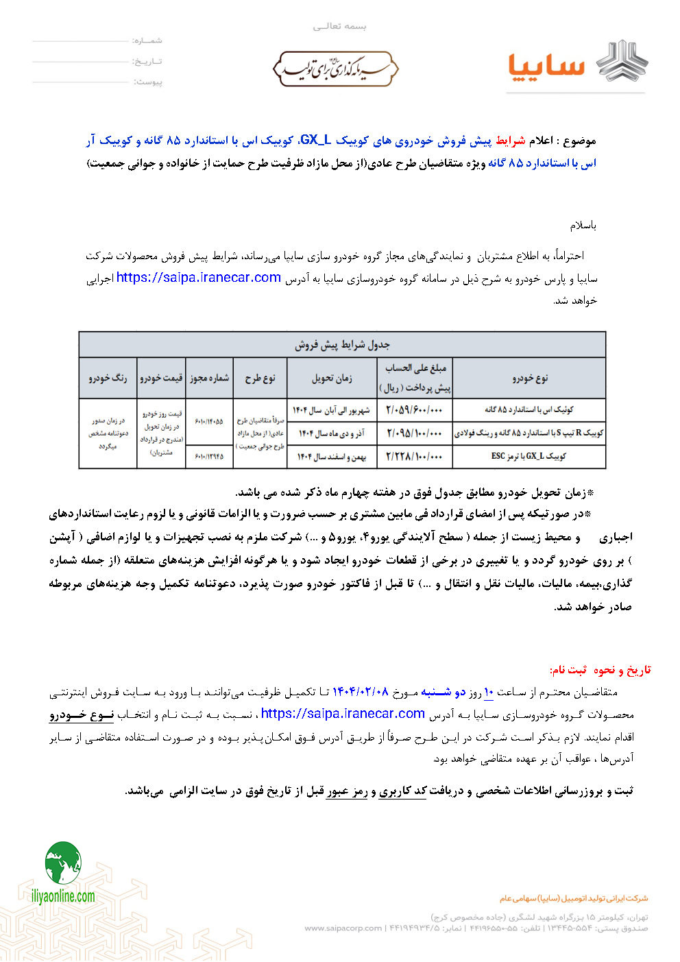 متقاضـیان محتـرم از سـاعت 10 روز دوشـنبه مــورخ 1404/02/08 تـا تکمیـل ظرفیـت میتواننـد بـا ورود بـه سـایت فـروش اینترنتـی محصـولات گــروه خودروسـازي ســایپا بـه آدرس ، https://saipa.iranecar.com نســبت بـه ثبـت نـام و انتخــاب نــوع خــودرو اقدام نمایند. لازم بـذکر اسـت شـرکت در ایـن طـرح صـرفاً از طریـق آدرس فـوق امکـانپـذیر بـوده و در صـورت اسـتفاده متقاضـی از سـایر آدرسها ، عواقب آن بر عهده متقاضی خواهد بود.