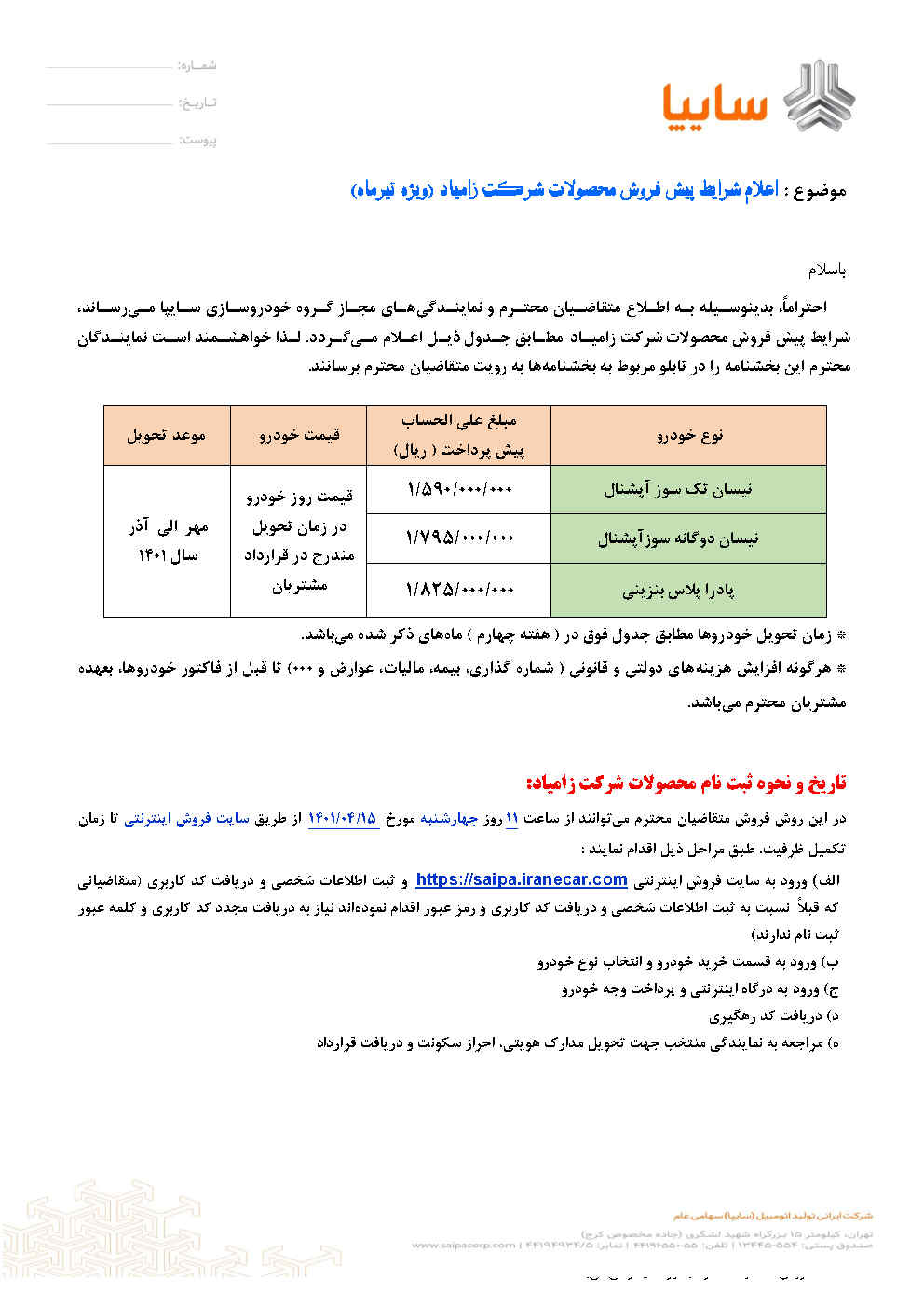 متقاضیان محترم میتوانند از ساعت 11 صبح روز چهارشنبه 1401/04/15 با ورود به سامانه یکپارچه تخصیص خودرو به آدرس https://sale.iranecar.com پس از ثبت اطلاعات شخصی و دریافت کد کاربری و رمز عبور اخذ شده از سایت، نسبت به انتخاب نوع خودرو و ثبت نام اقدام نمایند. لازم به ذکر است شرکت در این طرح صرفاً از طریق آدرس فوق امکان پذیر بوده و در صورت استفاده متقاضی از سایر آدرسها، عواقب آن بر عهده گروه خودروسازی سایپا نخواهد بود.
