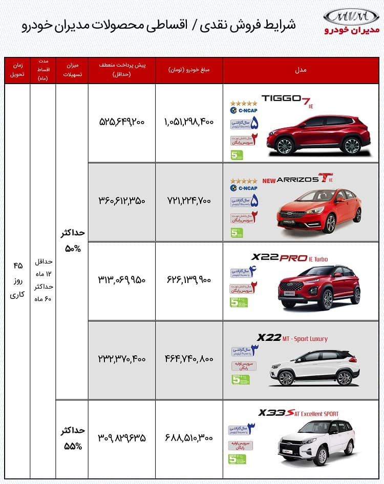 شرکت مدیران خودرو جدیدترین طرح فروش اقساطی محصولات خود ویژه اردیبهشت ماه ۱۴۰۱ را آغاز کرد. خودروهای عرضه شده در این طرح با موعد تحویل ۴۵ روزه و اقساط ۶۰ ماهه با پیش پرداخت حداقل ۵۰ درصد قیمت خودرو به مشتریان عرضه خواهد شد.