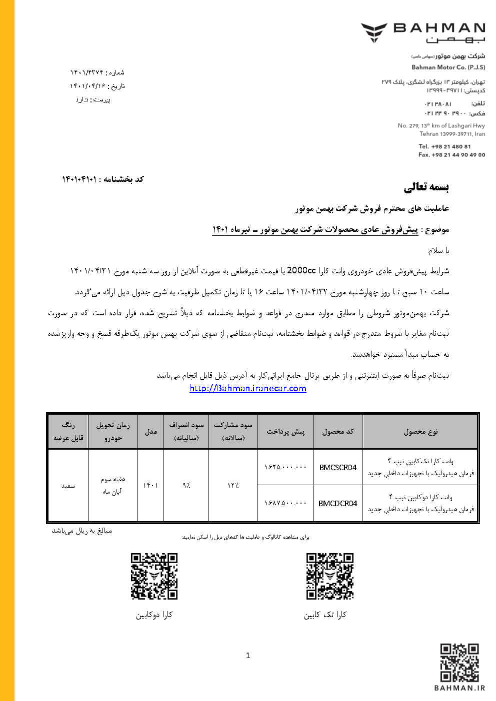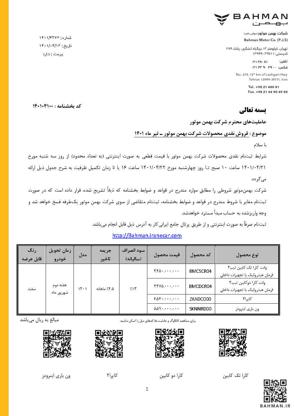 دانلود بخشنامه فروش 140104100 - فروش نقدی کارا تک و دو کابین ، کاپرا 2 و ون اینرودز