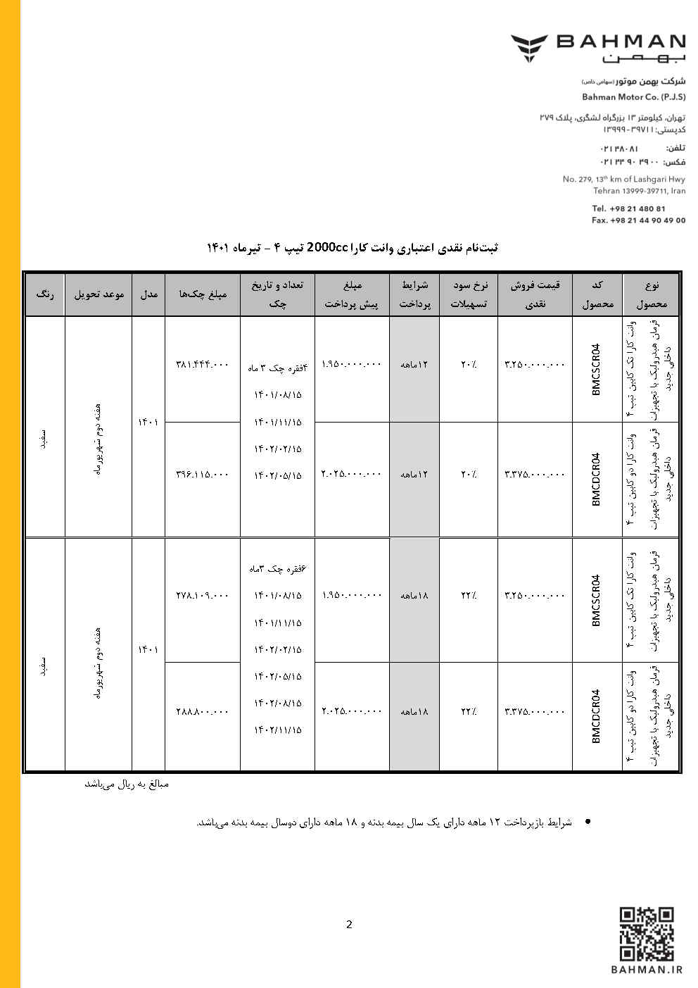 طرح جدید فروش نقدی و اقساطی محصولات گروه بهمن به صورت آنلاین از ساعت ۱۰ صبح روز سه شنبه مورخ ۲۱ تیرماه ۱۴۰۱ فعال خواهد شد.