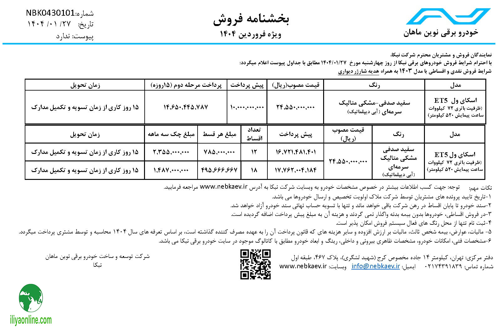 نبکا، اولین مونتاژ کننده خودروهای تمام برقی، تصمیم گرفته تا کراس اوور EV خود یعنی اسکای ول ET5 را با شرایط اقساطی ۱۲ و ۱۸ ماهه و بدون درنظرگرفتن هیچ افزایش قیمتی نسبت به سال گذشته به فروش برساند. این شرکت قرار است عرضه اولین خودروی تمام برقی مونتاژی بازار ایران را در خارج از سامانه یکپارچه و به صورت اینترنتی انجام دهد. به این ترتیب متقاضیان خرید قسطی اسکای ول ET5 می توانند با مراجعه به سایت nebkaev.ir/sales نسبت به ثبت نام و خرید اقدام کنند.