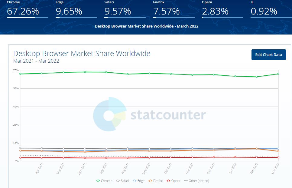 سهم مرورگرهای دسکتاپ در مارس 2022 به شرح زیر است: