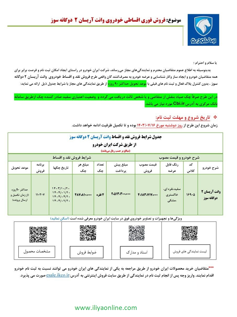 شرکت ایران خودرو در راستای پاسخگویی به نیاز بازار و تسهیل شرایط خرید برای متقاضیان، طرح جدید فروش فوری اقساطی وانت آریسان ۲ دوگانه سوز را از روز دوشنبه ۱۶ مهر ۱۴۰۳ آغاز میکند. این طرح بدون نیاز به کنترل پلاک فعال و ثبتنامهای قبلی اجرا خواهد شد.
