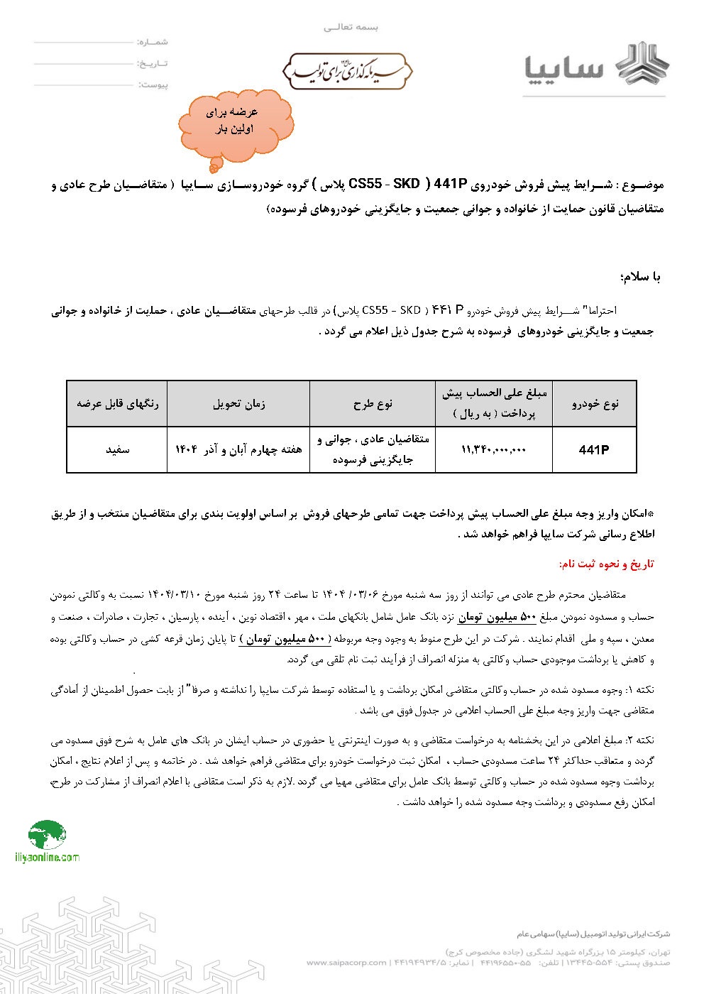 441P | 11,340,000,000 | متقاضیان عادي ، جوانی و جایگزینی فرسوده | هفته چهارم آبان و آذر | سفید |