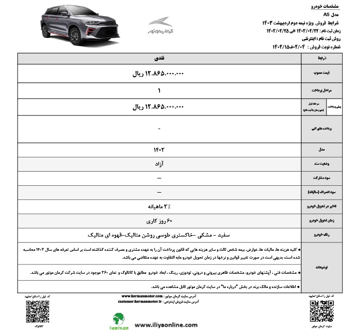 فروش KMC A5 از روز شنبه مورخ 22 اردیبهشت ماه آغاز می گردد و این کراس اوور متوسط با قیمت مصوب 12 میلیارد و 865 میلیون ریال و زمان تحویل 60 روز کاری به مشتریان عرضه خواهد شد. شرکت کرمان موتور با در اختیار داشتن شبکه گسترده خدمات پس از فروش و ارائه گارانتی 5 ساله یا 150 هزار کیلومتری، آرامش خاطر مشتریان را در خرید این خودرو تضمین مینماید.