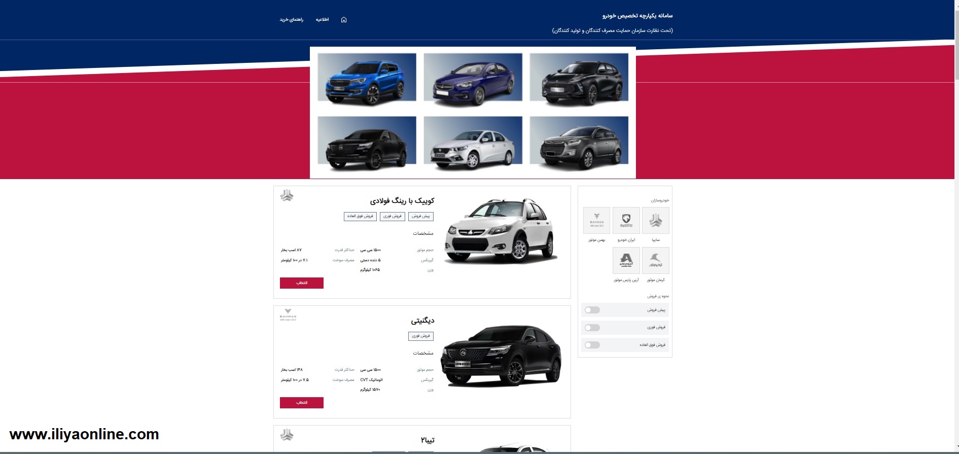 طبق اعلام روابط عمومی وزارت صنعت، معدن و تجارت، براساس اجرای بند ۵ از دستورات ابلاغی رئیسجمهوری در خصوص چگونگی عرضه خودرو برای ایجاد شفافیت و افزایش رضایتمندی مردم، سامانه یکپارچه تخصیص خودرو از امروز ساعت ۱۲ در نشانی sale.iranecar.com در دسترس است.