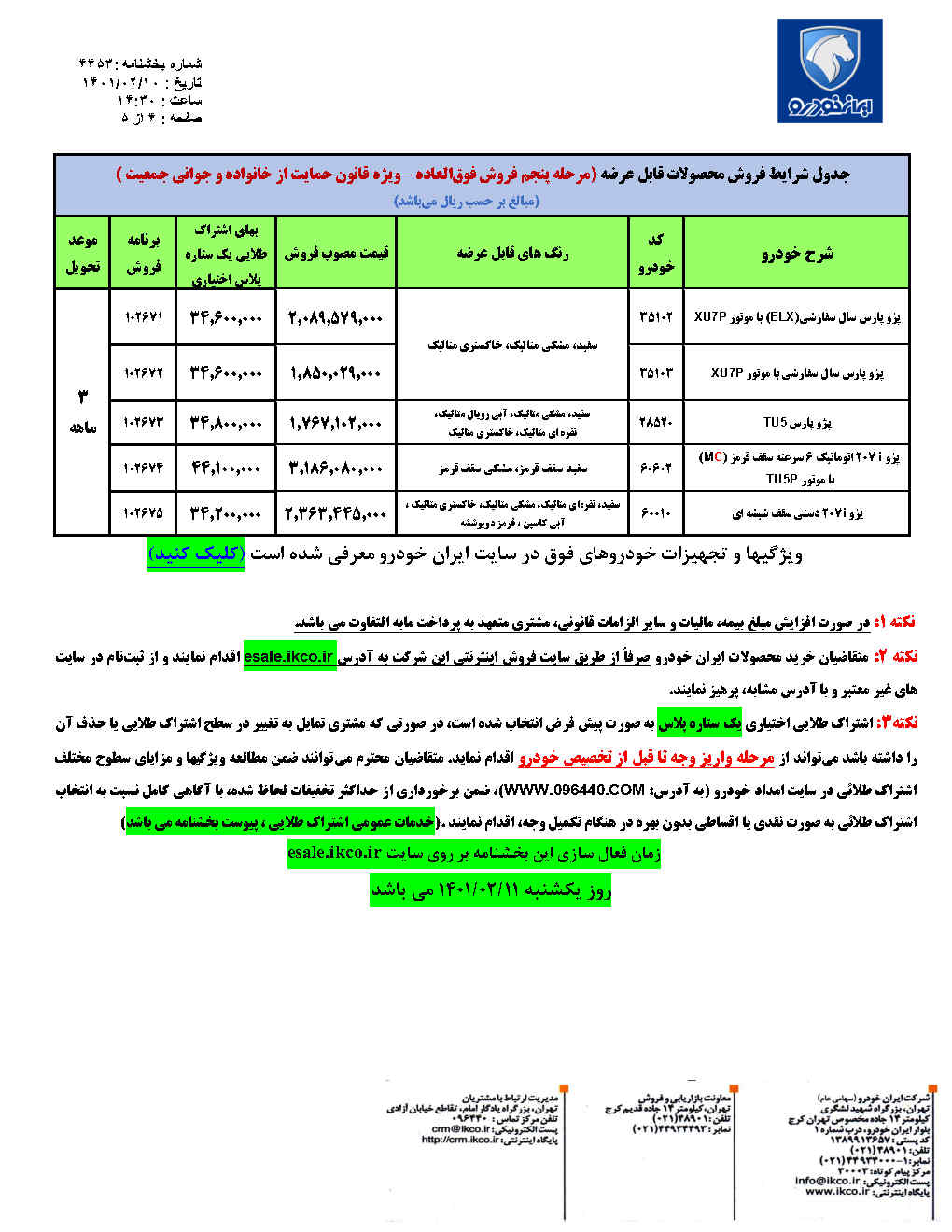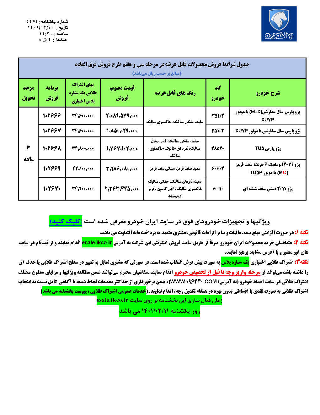 بخشنامه 53-4452- مرحله سی و هفتم فروش و پنجمین فروش فوق العاده ویژه قانون حمایت از خانواده و جوانی جمعیت محصولات ایران خودرو به مناسبت عید فطر (اردیبهشت ماه ) 1401