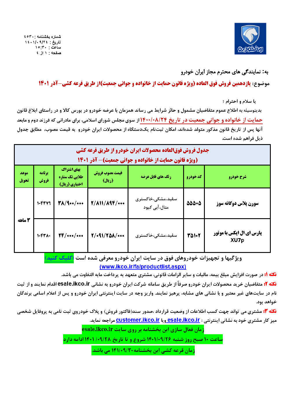طرح فروش فوق العاده (با موعد تحويل 90روزه) برخی محصولات شركت ايران خودرو ويژه قانون حمايت از خانواده و جواني جمعيت، (در صورت لزوم با روش قرعه كشي)، مطابق جدول ابتدای بخشنامه از روزشنبه مورخ 1401/09/26 شروع و تا تاريخ 1401/09/28 ادامه خواهد داشت.